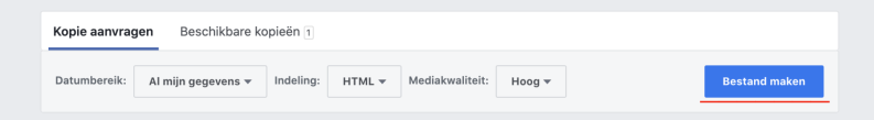 • U krijgt de mededeling dat uw gevraagde bestand gemaakt zal worden. Na enig moment (dit kan wel langer duren dan u zou verwachten) krijgt u de melding dat uw “Facebook-gegevensbestand kan worden gedownload”. Klik op deze melding.