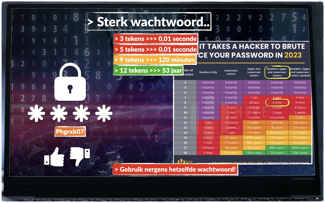 Het antwoord op deze vragen is niet zo eenvoudig als je misschien denkt. De effectiviteit van een wachtwoord hangt af van verschillende factoren, waaronder de lengte, complexiteit en zelfs de hardware en software die worden gebruikt om het te kraken. Gelukkig zijn er organisaties zoals 'Hive Systems' die uitgebreid onderzoek doen naar wachtwoordveiligheid. Ze hebben onlangs hun wachtwoordtabel voor 2023 gepubliceerd, die een gedetailleerd overzicht geeft van de tijd die nodig is om verschillende soorten wachtwoorden te kraken.