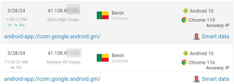 Ik had verwacht dat de oplichter met de 2 e-mail adressen hetzelfde toestel zou gebruiken en uit Nigeria zou komen. Dit blijkt niet het geval te zijn, het zijn 2 aparte adressen, beide afkomstig uit het zuiden van Benin.