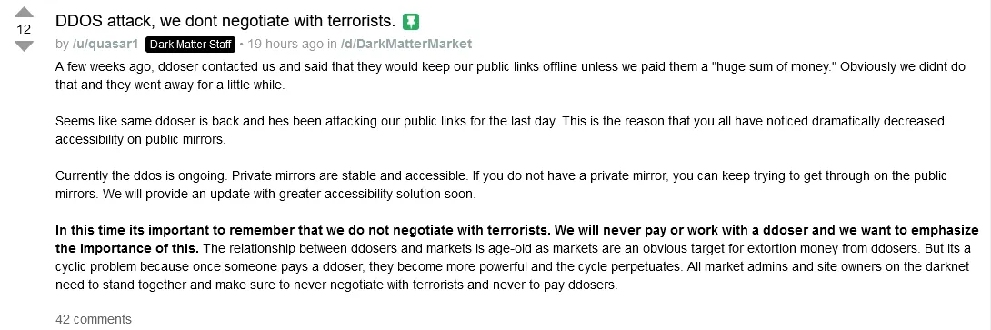 De Dark Matter Darknet Market kampt momenteel met een ernstige DDoS-aanval (Distributed Denial of Service) die de toegang tot hun platform belemmert. Deze aanval heeft geleid tot aanzienlijke vertragingen en onbereikbaarheid van de marktplaats voor gebruikers. Het Dark Matter-team heeft aangegeven hard te werken aan het oplossen van het probleem en de aanval te mitigeren. Ze hebben hun infrastructuur versterkt en hun gebruikers gewaarschuwd voor de mogelijke gevolgen van de verstoring. DDoS-aanvallen zijn een veelvoorkomend probleem op darkweb-markten, waarbij aanvallers proberen de toegang tot een site te blokkeren door deze te overspoelen met verkeer. Hoewel de marktplaats momenteel niet volledig operationeel is, blijven de beheerders zoeken naar effectieve oplossingen om de service te herstellen en toekomstige aanvallen te voorkomen.