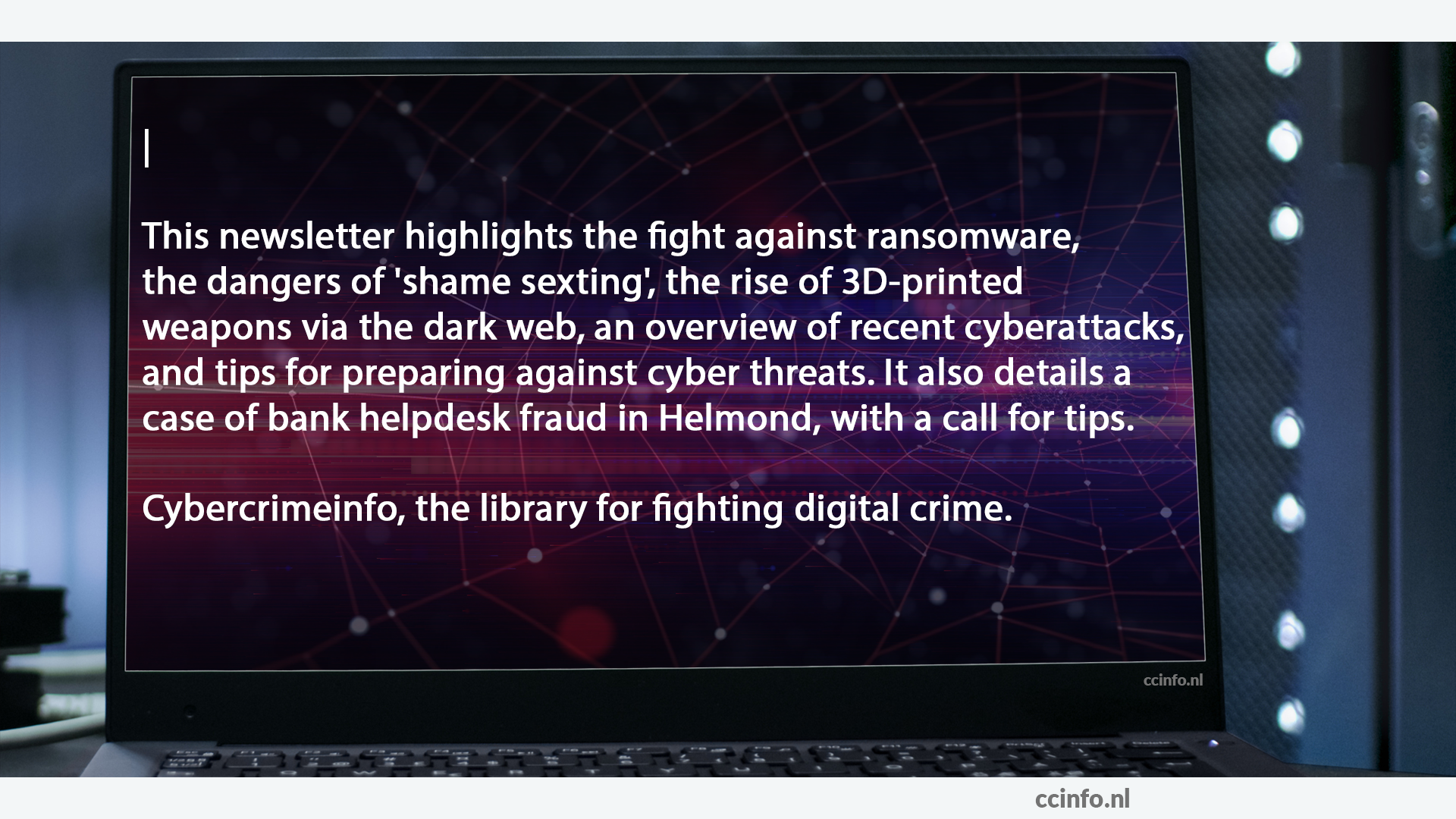 Deze nieuwsbrief belicht de strijd tegen ransomware, de gevaren van 'shame sexting', de opkomst van 3D-geprinte wapens via het darkweb, een overzicht van recente cyberaanvallen, en tips voor het voorbereiden op cyberdreigingen. Ook wordt een geval van bankhelpdeskfraude in Helmond uitgelicht, met een oproep tot tips.