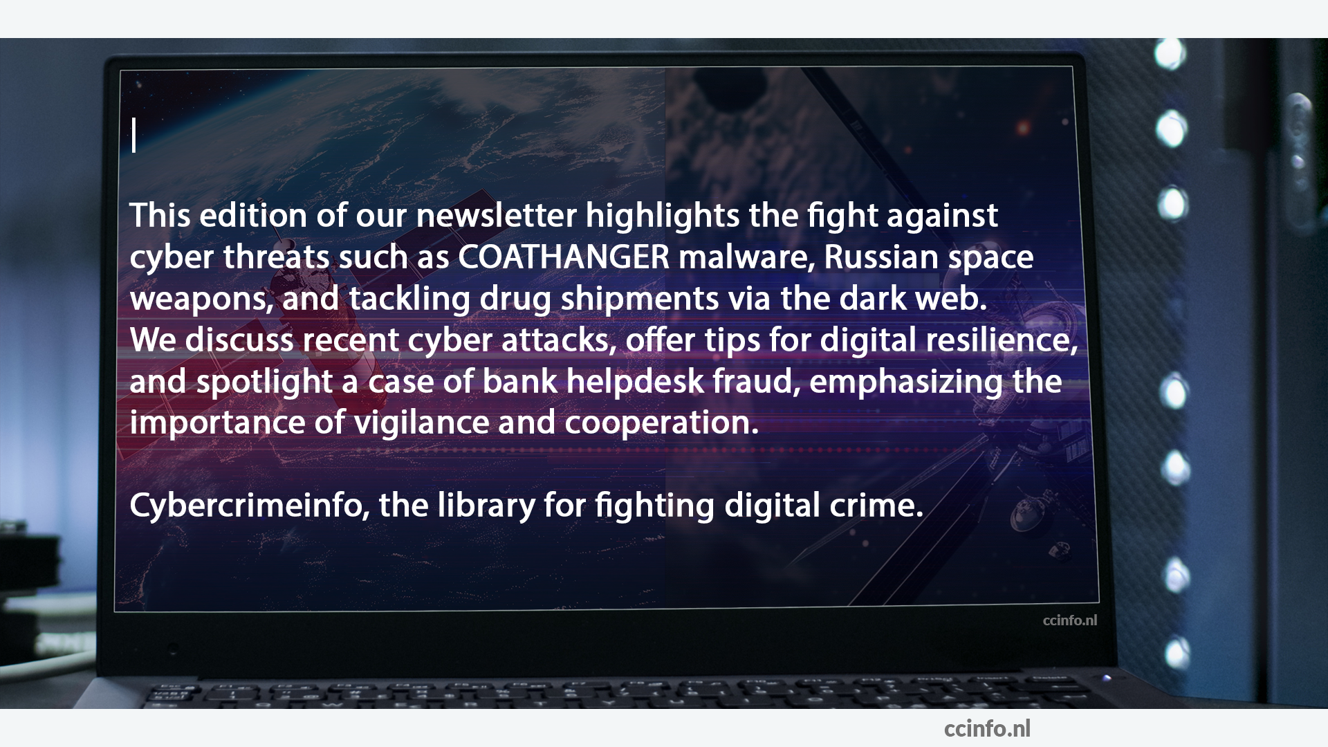 Deze editie van onze nieuwsbrief belicht de strijd tegen cyberdreigingen zoals COATHANGER-malware, ruimtewapens van Rusland, en de aanpak van drugszendingen via het darkweb. We bespreken recente cyberaanvallen, bieden tips voor digitale veerkracht en belichten een geval van bankhelpdeskfraude, benadrukkend het belang van waakzaamheid en samenwerking.
