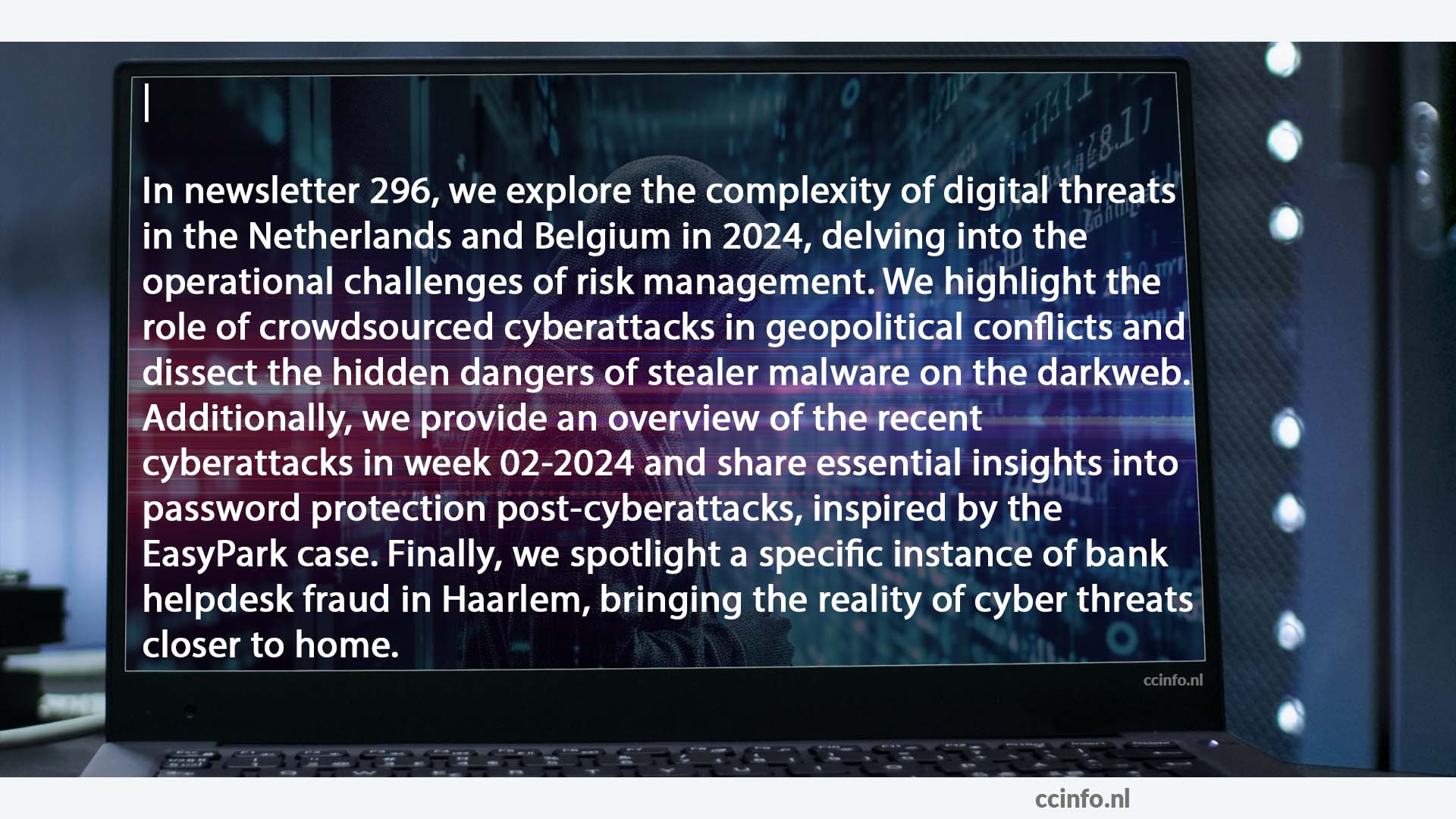 In nieuwsbrief 297 verkennen we de complexiteit van digitale dreigingen in Nederland en België in 2024, met een diepe duik in de operationele uitdagingen van risicobeheer. We belichten de rol van crowdsourced cyberaanvallen in geopolitieke conflicten en ontleden de verborgen gevaren van stealer malware op het darkweb. Daarnaast bieden we een overzicht van de recente cyberaanvallen in week 02-2024, en delen we essentiële inzichten in wachtwoordbeveiliging na cyberaanvallen, geïnspireerd door de case van EasyPark. Tot slot belichten we een specifiek geval van bankhelpdesk fraude in Haarlem, waarmee de realiteit van cyberdreigingen dichtbij huis wordt gebracht.