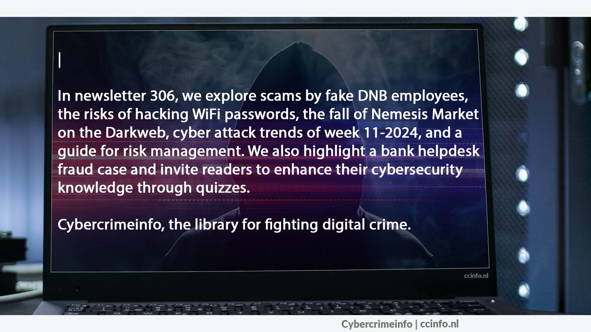 In onze nieuwste nieuwsbrief, nummer 306, belichten we een scala aan actuele thema's op het gebied van cyberbeveiliging en de strijd tegen cybercriminaliteit. We duiken in de nieuwste trucs van oplichters die zich voordoen als medewerkers van De Nederlandsche Bank om via spoofing technieken geld en persoonlijke gegevens te ontvreemden. We onthullen ook hoe het hacken van wifi-wachtwoorden een steeds groter risico vormt voor zowel particuliere als zakelijke netwerken en bieden strategieën om je netwerk te beveiligen. Daarnaast brengen we het verhaal van de ondergang van Nemesis Market, een donkere plek op het internet waar illegale handel bloeide, totdat een internationale wetshandhavingsactie hier een einde aan maakte.