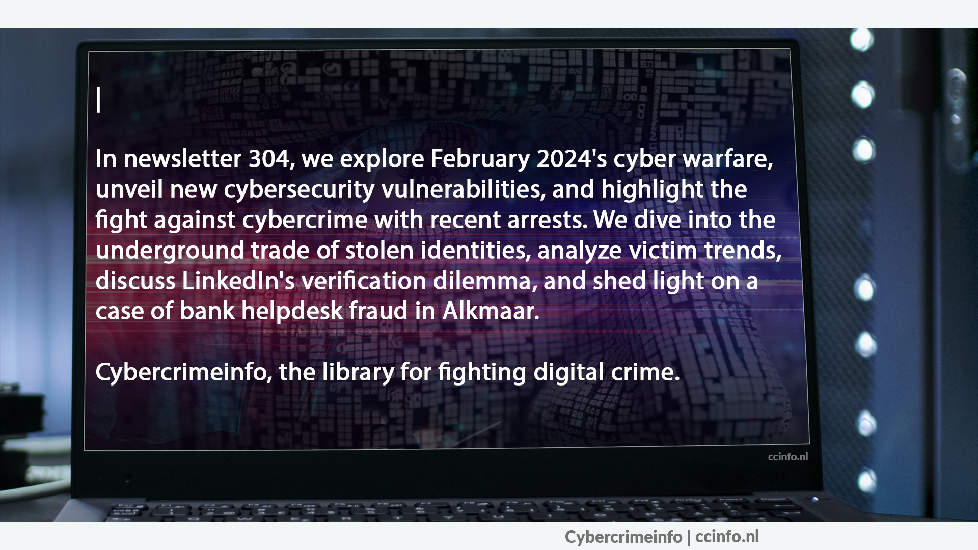 In onze nieuwste nieuwsbrief, nummer 295, bieden we een diepgaande blik op de wereld van cybercriminaliteit en -veiligheid van december 2023. Ontdek de laatste ontwikkelingen in de cyberoorlog, krijg inzicht in kritieke kwetsbaarheden, blijf op de hoogte van politie cyber nieuws, en leer hoe je jezelf kunt beschermen tegen nieuwe vormen van cyberaanvallen zoals doxing en bankhelpdeskfraude.