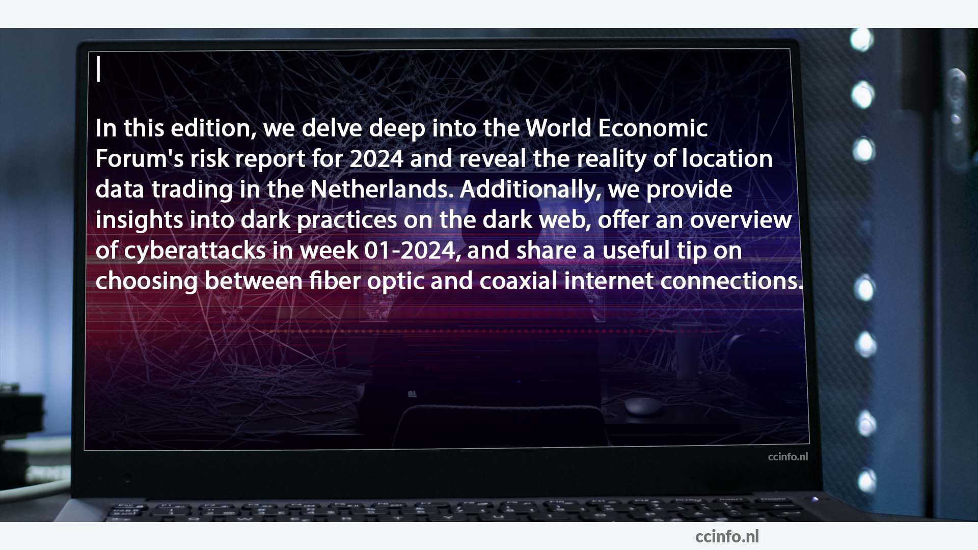 In deze editie duiken we diep in het World Economic Forum's risicorapport 2024 en onthullen we de realiteit van locatiedatahandel in Nederland. Daarnaast bieden we inzicht in duistere praktijken op het darkweb, geven we een overzicht van cyberaanvallen in week 01-2024, en delen we een handige tip over de keuze tussen glasvezel en coax voor uw internetverbinding.