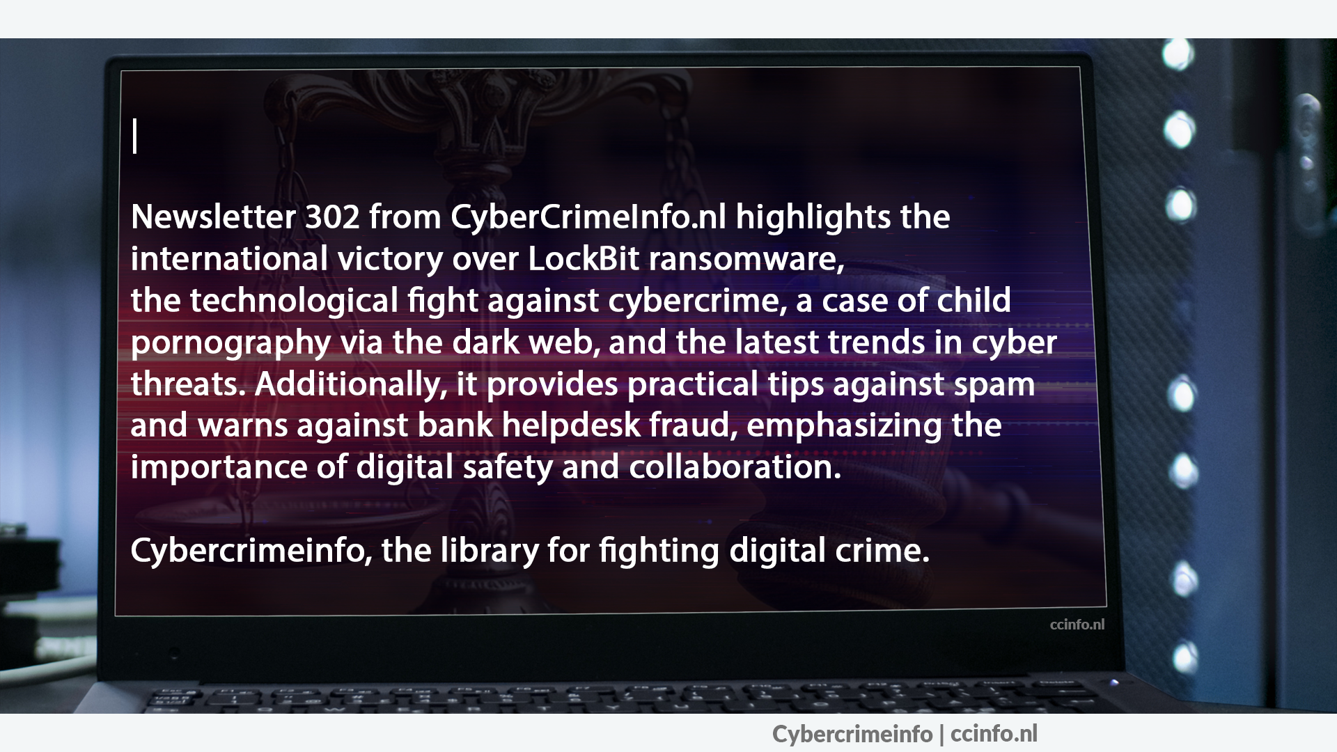Nieuwsbrief 302 van CyberCrimeInfo.nl belicht de internationale overwinning op LockBit ransomware, de technologische strijd tegen cybercriminaliteit, een zaak van kinderpornografie via het darkweb, en de nieuwste trends in cyberdreigingen. Daarnaast biedt het praktische tips tegen spam en waarschuwt voor bankhelpdeskfraude, onderstrepend het belang van digitale veiligheid en samenwerking.