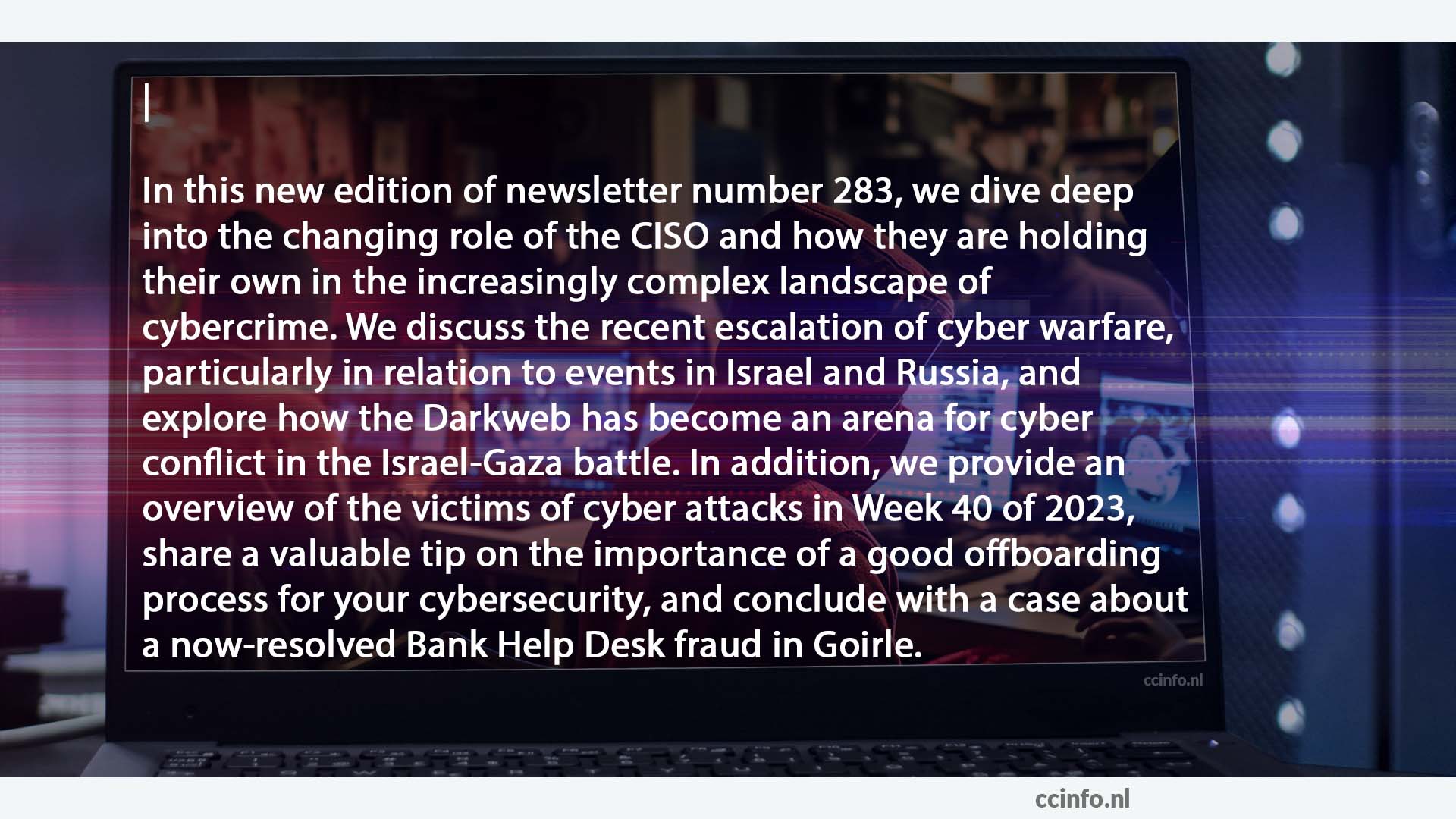 In deze nieuwe editie van nieuwsbrief nummer 283 duiken we diep in de veranderende rol van de CISO en hoe deze zich staande houdt in het steeds complexere landschap van cybercriminaliteit. We bespreken de recente escalatie van cyberoorlog, met name in relatie tot gebeurtenissen in Israël en Rusland, en verkennen hoe het Darkweb een arena is geworden voor cyberconflicten in de Israël-Gaza strijd. Daarnaast bieden we een overzicht van de slachtoffers van cyberaanvallen in week 40 van 2023, delen we een waardevolle tip over het belang van een goed offboarding proces voor uw cybersecurity, en sluiten we af met een case over een inmiddels opgeloste Bankhelpdesk fraude in Goirle.