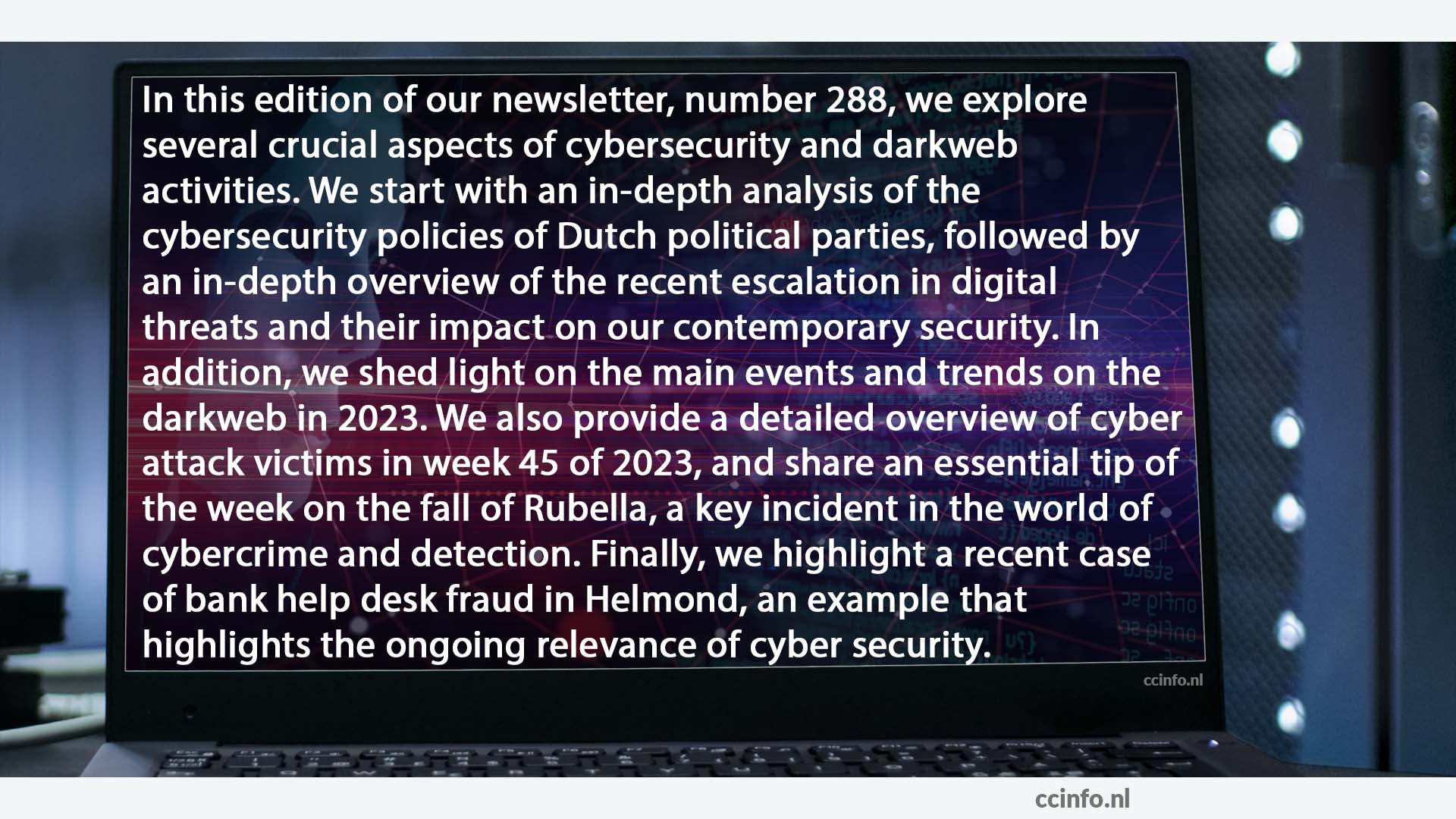 In deze editie van onze nieuwsbrief, nummer 288, verkennen we diverse cruciale aspecten van cyberveiligheid en darkweb-activiteiten. We beginnen met een grondige analyse van het cybersecurity beleid van Nederlandse politieke partijen, gevolgd door een diepgaand overzicht van de recente escalatie in digitale dreigingen en de invloed daarvan op onze hedendaagse veiligheid. Daarnaast werpen we een licht op de belangrijkste gebeurtenissen en trends op het darkweb in 2023. We bieden ook een gedetailleerd overzicht van de slachtoffers van cyberaanvallen in week 45 van 2023, en delen een essentiële tip van de week over de val van Rubella, een belangrijk voorval in de wereld van cybercriminaliteit en opsporing. Ten slotte, belichten we een recent geval van bankhelpdeskfraude in Helmond, een voorbeeld dat de voortdurende relevantie van cyberveiligheid benadrukt.