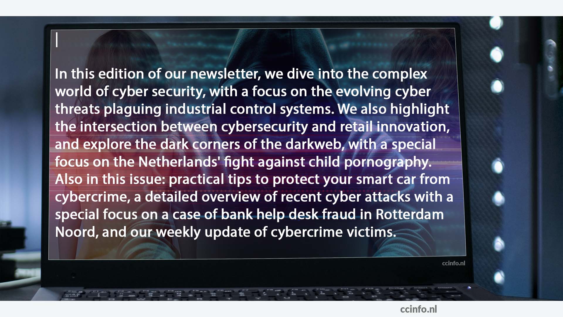 In deze editie van onze nieuwsbrief duiken we in de complexe wereld van cyberveiligheid, met een focus op de evoluerende cyberdreigingen die industriële controlesystemen teisteren. We belichten ook de kruising tussen cyberveiligheid en retail innovatie, en verkennen de duistere hoeken van het darkweb, met een speciale focus op Nederland's strijd tegen kinderpornografie. Verder in deze uitgave: praktische tips om uw slimme auto te beschermen tegen cybercriminaliteit, een gedetailleerd overzicht van recente cyberaanvallen met speciale aandacht voor een geval van bankhelpdesk fraude in Rotterdam Noord, en onze wekelijkse update van cybercrime slachtoffers.