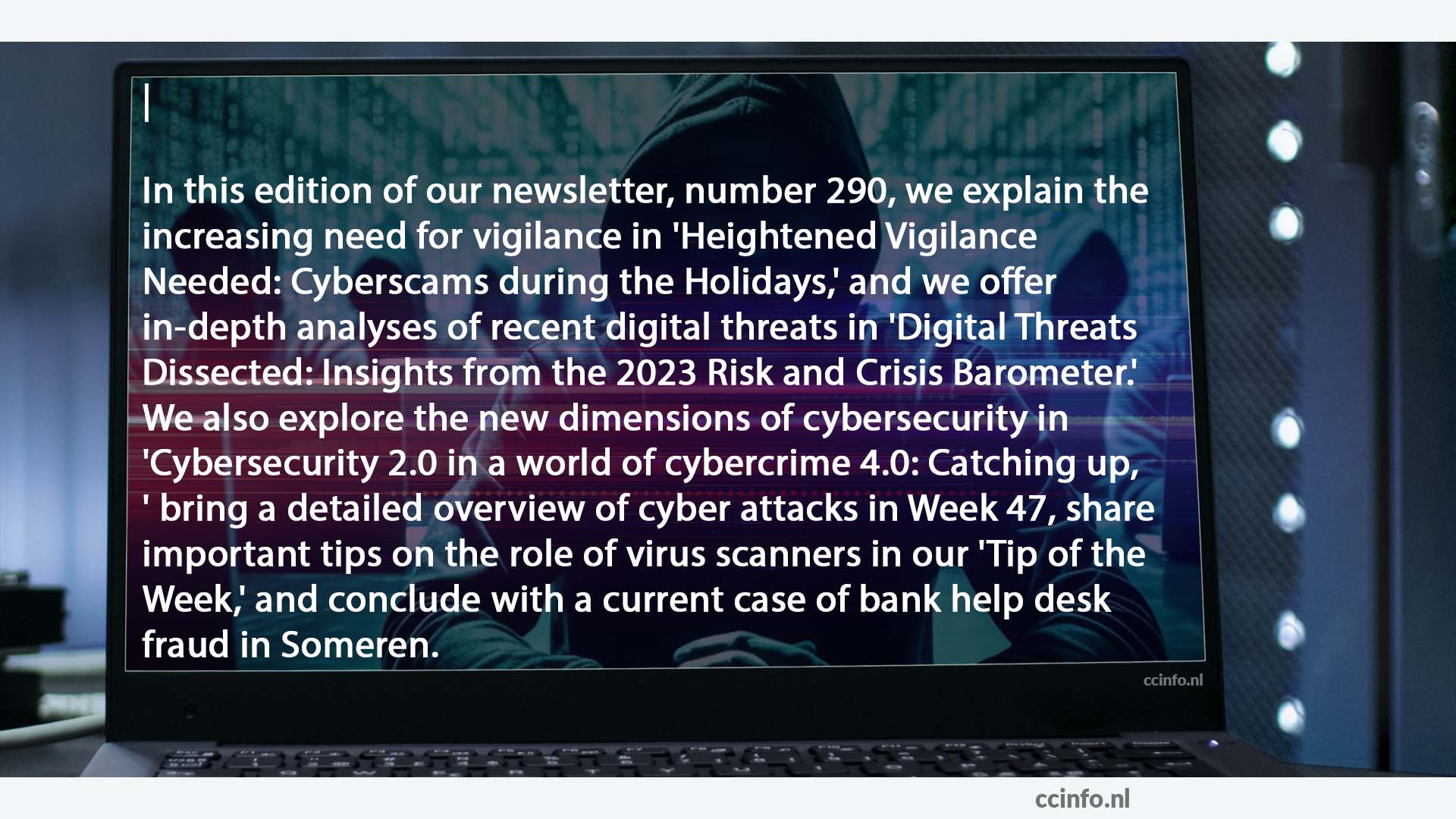 In deze editie van onze nieuwsbrief, nummer 290, lichten we de toenemende noodzaak tot waakzaamheid toe in 'Verhoogde waakzaamheid noodzakelijk: Cyberscams tijdens de feestdagen', en bieden we diepgaande analyses van de recente digitale dreigingen in 'Digitale dreigingen ontleed: Inzichten uit de Risico- en Crisisbarometer 2023'. Daarnaast verkennen we de nieuwe dimensies van cyberbeveiliging in 'Cybersecurity 2.0 in een wereld van cybercrime 4.0: De inhaalslag', brengen we een gedetailleerd overzicht van cyberaanvallen in week 47, delen we belangrijke tips over de rol van virusscanners in onze 'Tip van de week', en sluiten we af met een actueel geval van bankhelpdeskfraude in Someren.