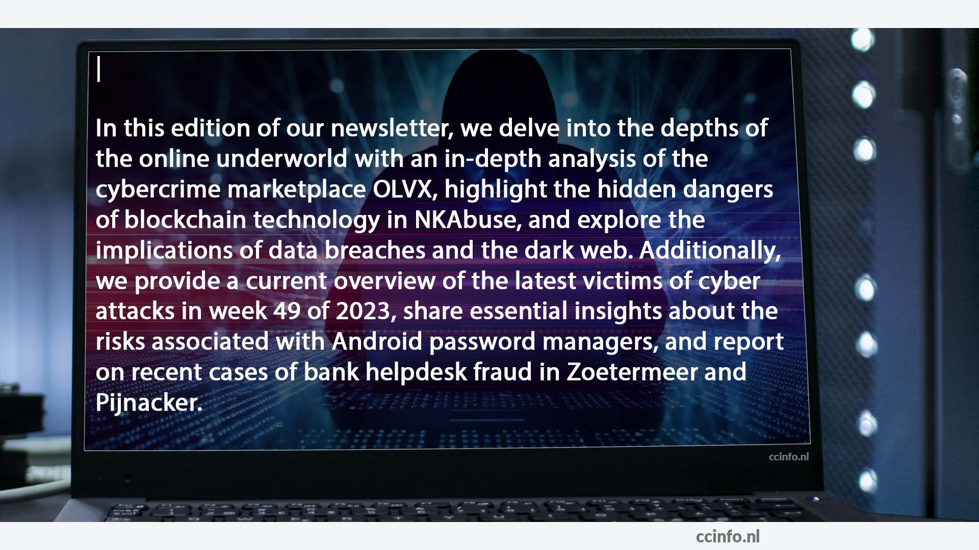 In deze editie van onze nieuwsbrief duiken we diep in de krochten van de online onderwereld met een grondige analyse van de cybercrime marktplaats OLVX, belichten we de verborgen gevaren van blockchain-technologie in NKAbuse, en onderzoeken we de implicaties van datalekken en het darkweb. Daarnaast bieden we een actueel overzicht van de recentste slachtoffers van cyberaanvallen in week 49 van 2023, delen we essentiële inzichten over de risico's van Android wachtwoordmanagers, en rapporteren we over recente gevallen van bankhelpdeskfraude in Zoetermeer en Pijnacker.