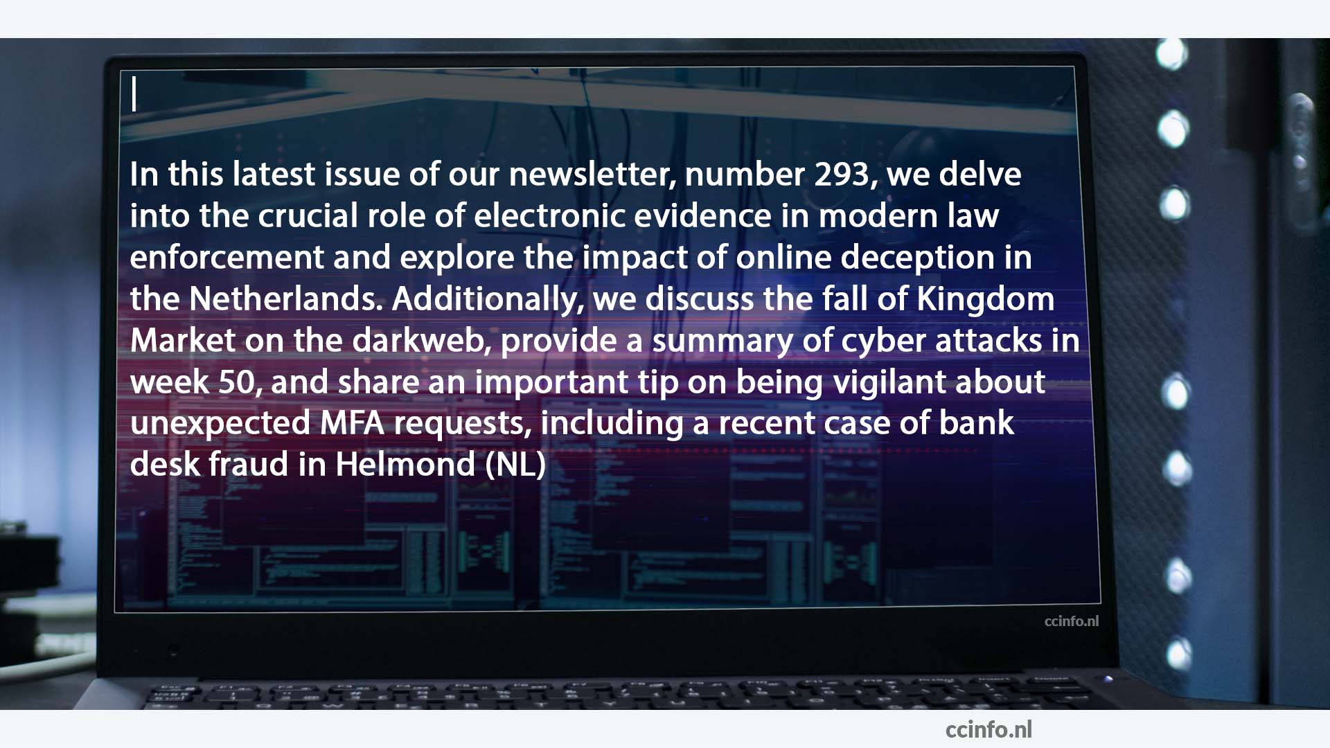 In deze nieuwe editie van onze nieuwsbrief, nummer 293, duiken we in de cruciale rol van elektronisch bewijs binnen de moderne rechtshandhaving en onderzoeken we de impact van online misleiding in Nederland. Verder bespreken we de val van Kingdom Market op het darkweb, geven we een overzicht van de cyberaanvallen in week 50, en delen we een belangrijke tip over waakzaamheid bij onverwachte MFA-verzoeken, inclusief een recent voorval van bankhelpdeskfraude in Helmond.