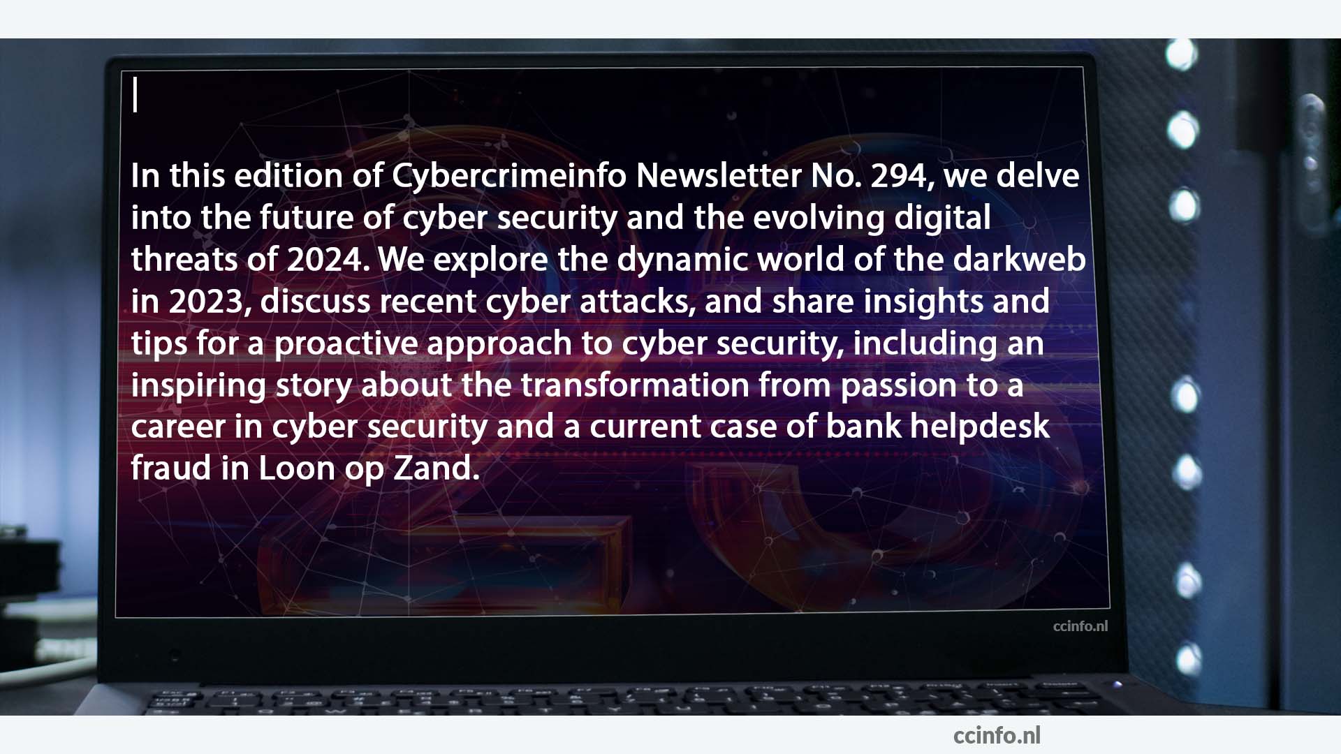 In deze uitgave van Cybercrimeinfo Nieuwsbrief nr. 294 duiken we in de toekomst van cyberveiligheid en de evoluerende digitale dreigingen van 2024. We verkennen de dynamische wereld van het darkweb in 2023, bespreken recente cyberaanvallen, en delen inzichten en tips voor een proactieve benadering van cyberbeveiliging, waaronder een inspirerend verhaal over de transformatie van passie naar een carrière in cyberbeveiliging en een actuele case van bankhelpdesk fraude in Loon op Zand.