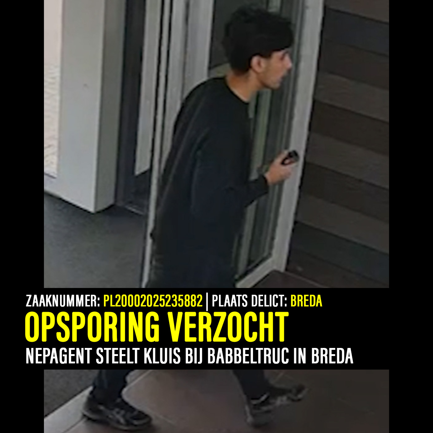 Een oudere vrouw uit de wijk IJpelaar in Breda werd op woensdag 3 september 2025 gebeld door iemand die zich voordeed als politieagent. Even later stond een jonge verdachte voor haar deur, die er met haar kluis vandoor ging. De kluis werd later teruggevonden, maar de inhoud was verdwenen. De politie zoekt de verdachte via Bureau Brabant en vraagt het publiek om hulp.