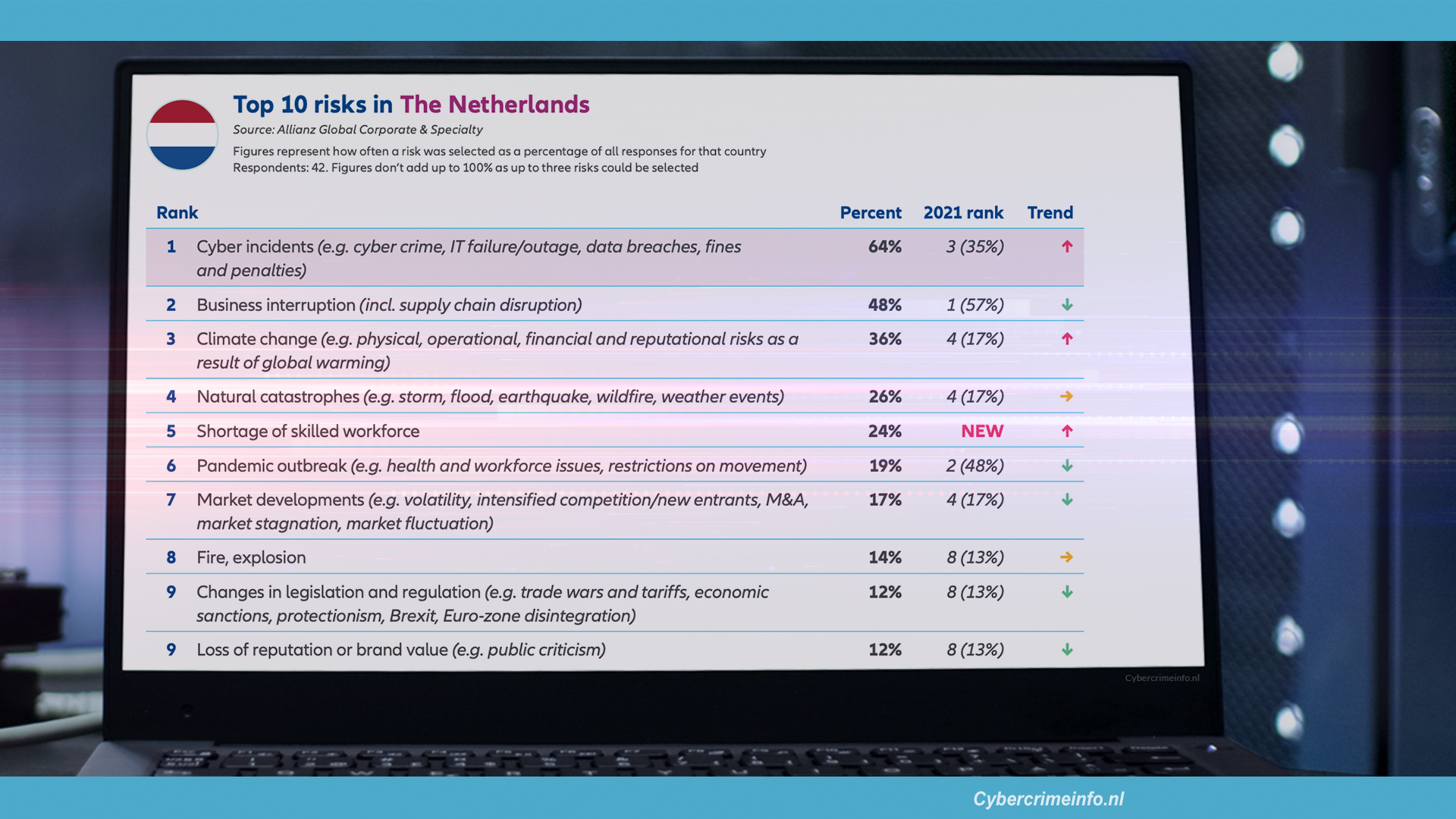 Cyberincidenten klimmen van de derde naar de eerste plaats, met een stijging van 35 procent naar 64 procent. Bedrijfsonderbreking daalt naar de tweede plaats (48 procent), en staat voor de eerste keer in zes jaar niet op de eerste plaats. De grootste stijger is klimaatverandering, dat stijgt van 17 naar 36 procent en van de vierde naar de derde plaats gaat.