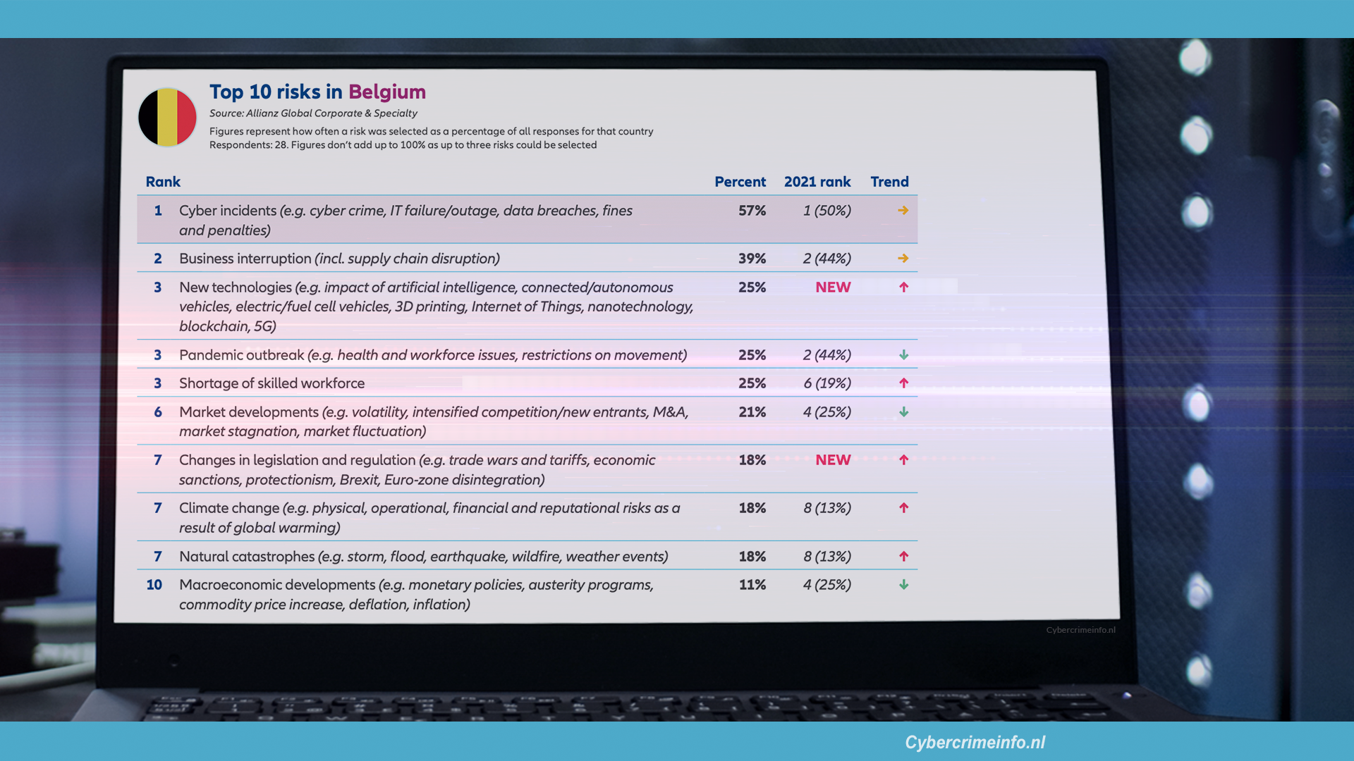 Cyberincidenten blijft op de eerste plaats staan, met een stijging van 50 procent naar 57 procent. Bedrijfsonderbreking blijft even eens op de tweede plaats staan maar daalt van 44 procent naar 39 procent. Nieuw in de lijst en komt binnen met stip op nummer 3 zijn nieuwe technologieën met 25 procent.