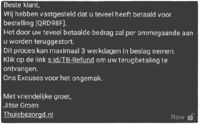 De link achter s.id/TB-Refund verwijst naar het domein vvvvvvvvvvvvvvvvvvvvvvvvvvvvvvvvvvvvvvvvvvvvvvvvvvvv.xyz/pay/61afa65ec3d05. Of de bouwer in een moment van uitzonderlijke creativiteit dacht 'ja, maar dát is nog eens een overtuigende domeinnaam' of dat er simpelweg wat saus van een Thuisbezorgd-bestelling op het toetsenbord belandde waardoor de 'v'-toets klem zat, laten we maar even in het midden.